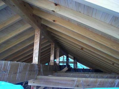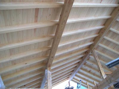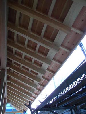 写真は軒先。 二重垂木でなんだか賑やかだが、屋根通気層を伴う場合、自然にこのような美しい軒天井になる。