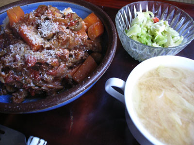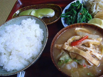 写真、昼めし、昨晩のスジシチューの残りと、朝の浅漬けとミソスープの残りもの。 | |
