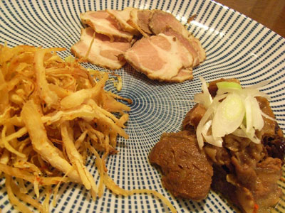 写真、最近しょっちゅうつくりおきしてあるつまみ。 題して「牛豚鶏の三点盛」……「猪鹿蝶三点盛り」だともっとグッと来るのだが……。 牛:牛スジ煮込み、味噌を加えより大衆化した味に 豚:焼豚、ローリエやタイム赤ワインなどで欧米な感じに 鶏:ぱさぱさした胸肉を茹で、冷やし、手で裂き、フライパンの上で弱火で炒りカリカリに
