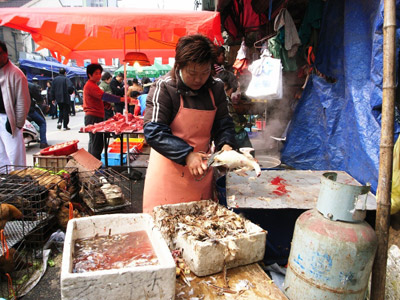 上海の路上の市場。 客が生きたままの「鶏、あひる、うずら」などをみさだめ、すぐに店の人が「絞める、血抜き、茹でる、毛をむしる、捌く、内蔵を取り出し、砂肝を取り出す……」という作業を行う。