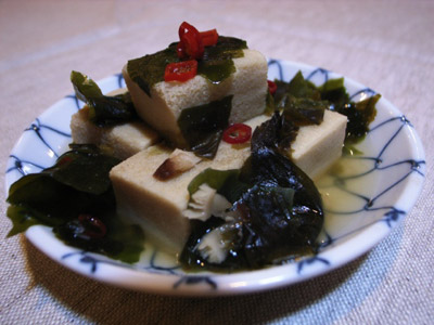 ふきを煮た汁があまったので、ちょっと砂糖とわかめを入れて高野豆腐にした。 |