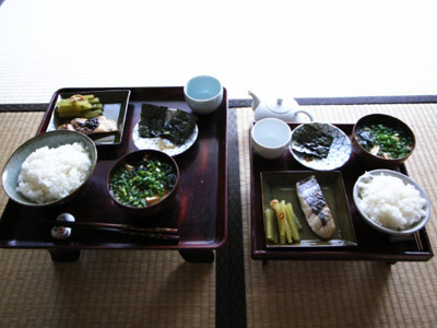 白めし、わかめ・とうふ・ねぎのみそ汁、めだいの自家製西京漬、ふき、焼きのり、茶。