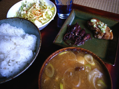 連れ合いが、皮付きのタケノコを前日から糠とかで仕込みしておいてくれた。 タケノコめし、なめこみそ汁、キャベツとわかめの浅漬け。