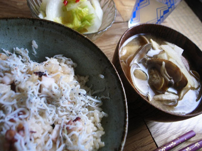 福島のタコでたこ飯・しらす、あさり・だいこん・しめじのみそ汁、白菜の浅漬け。