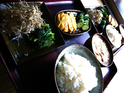 朝めし。 白米、大根(おにおろし)に小女子(こうなご)、ほうれん草、卵焼、キュウリのぬか漬け、なめこ・油揚げ・大根のみそ汁。