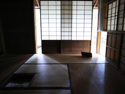 その茶室、四畳半マニアには垂涎のしろもの……。 ちょっと窓の多い小堀遠州よりの「きれいさび」的ではあるが、曇っている日の午後、その光……、えもいわれぬ美しさ……。畳への反射までも計算……というよりも、それは常識。 ちょっと貴人口が大きく明るすぎて、にじり口がかすんでいるが、いさぎよい。個人的にはもう少し壁がないと不安で、かつ「草」な感じがしない。骨格が表現され過ぎ……。しかし、床の間は「塗り込め」ているが、「ほらどこ」までは行き着かせていない……、かつ墨蹟窓も無く、ただただそのコントラストによって漆黒へと沈んでゆく……。おそらく、ここに掛けられた書画の細部に目が明暗順応するまでにはかなりの時間がかかるはず……その「ものがみえるまでの時間」までもが計算つくされているのか……恐るべき五十八(愛をこめてk2はイソッパチと呼んでいる……)