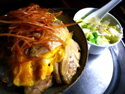 § 午めし。 五香粉の風味がする蒸し鶏で親子丼にラー油漬けで一晩置いた白髪ネギをのせて。 蒸しものをした後のエキスたっぷりの汁はスープなどに使うと格別にうまい。キャベツと大根を入れて。