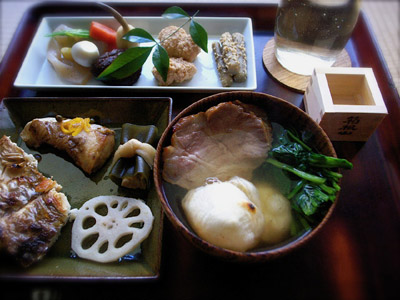 午、明石の酒を、足柄上郡「箱根山」のかわいい枡にそそぎ、明石の鯛をたべながら、正月。