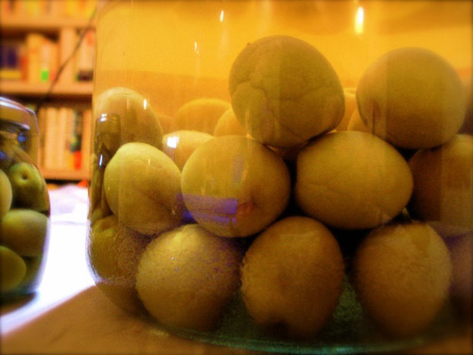 写真、連れ合いが昨年の6月くらいに漬けた梅酒を、味わう。
