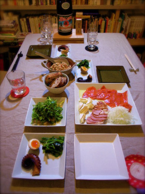 松もとれた夜、連れ合いに料理をつくってもらい、近所のサイトー君を招く。 伊佐美を6合ほどあけ、夜が更ける。