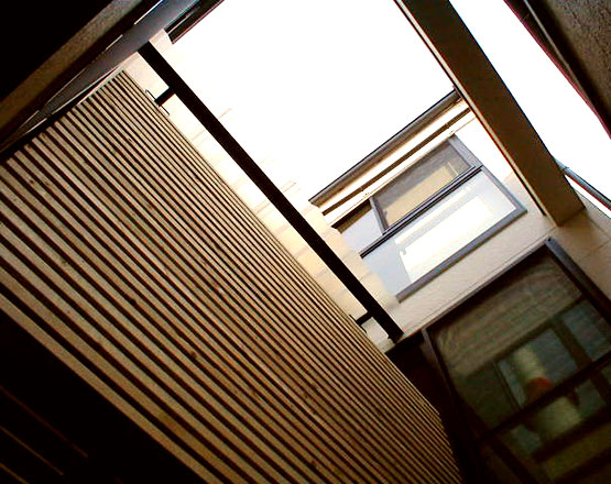敷地は細長く、かつ南側には一段高くなった敷地に隣家がせまっているという悪条件。そこに将来2世帯で住めるような面積の確保が必要でした。鉄骨造の3階建てとし、わずかな光の差し込む南側に中庭をもうけて、それに“光井戸”の役割を担わせました。結果としてその“光井戸”は光や風を取り入れることだけでなく、1階から3階までのコミュニケーションの柱としても重要な意味をもつことになりました。