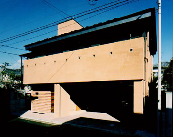 路地的な道路に面した住宅。外には閉じ、中庭を設け内に開かれた空間を基本に構成されています。明るい中庭を感じながら階段を上がり、2階のゲストルームまではテラコッタのタイルが続き、靴を脱がせずにお客さまをもてなすことのできる工夫をしています。スペインのテラコッタに、ニッポンの障子と畳、そしてアジア的なチーク材……和・洋・中の境界をとりはらい、混在させた新しいニッポン的な空間がそこにはあります。