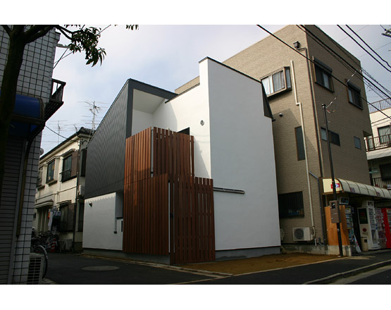 建築面積10坪の狭小住宅にもかかわらず、駐車スペース、玄関前の庭、2階テラス、屋上……と、プライバシーを確保しつつも外部との関わりをもつ空間によって全体を構成しました。白と黒の明解な外観とは対照的に、内部は珪藻土の塗壁と木を基本にしたあたたかく落着いた空間になっています。階段の途中に設けた書斎など、小さな工夫や遊び心にもあふれています。