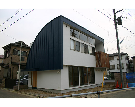 特徴的な文脈が希薄で、周辺にはハウスメーカーの住宅が立ち並んでいます。そんな環境の中、南西角地であることを生かし、子供達が一目見て「〜の家」と表現できるような幾何学的で明解なカタチと色を表現しました。その外観とは対照的に、内部は構造材を力強く現し、木の温もりが感じられる空間としました。また照明もその構造材とからませた建築化照明とし、光と構造に一体感を与えました。