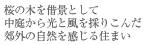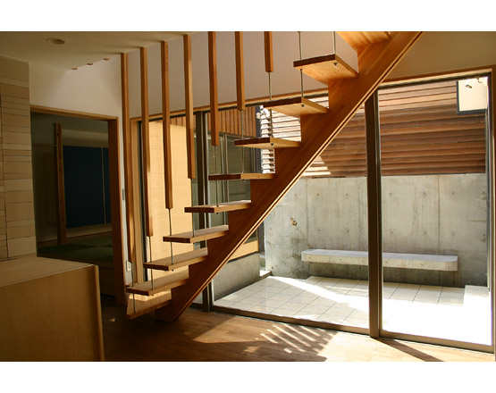 旗竿の敷地で周りは住宅に囲まれ、かつ敷地の南側に山と自然がせまって日射しを遮る……という厳しい条件の中、西側に中庭をもうけ、それをグルリと囲むように各部屋を配置しました。また、南側部分は低くして中庭に良好な光を採り入れるとともに、春には隣地の桜を存分に楽しめるようにもなっています。また中庭には、プライバシーを確保しながらも、どこにいても家族の雰囲気が感じられるといった効果もあります。