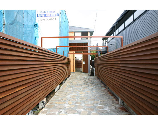 典型的な旗竿状の敷地。その長いアプローチが逆にこの住宅の特徴となっています。周囲の視線から守られたアプローチを抜けると、広い土間状の玄関へ、そして目の前には中庭が現れます、その先には小さなプールがあり、水の流れる音が聞こえます……。光や風、素材や音を感じながら、単調ではないのに途切れることのない連続的な光景が展開することがこの住宅の特徴です。