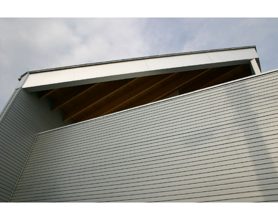 施主の趣味はサーフィン。「毎日海に出たい……」そんな気持ちが高まり、ここ湘南の鵠沼海岸に移り住むことになりました。強い日射しと潮気を帯びた風、そして巻き上がる砂……、そういった厳しい環境条件の中、屋根=天井は構造材を力強く現し、真南にむかってめくれたような形状(変形HPシェル構造)とし、光と風をたっぷりと感じられるようにしました。