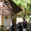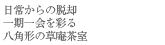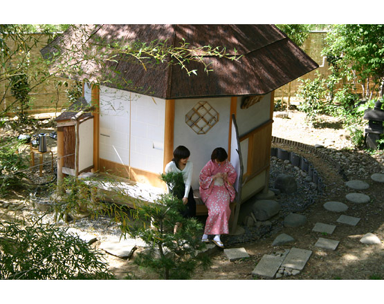 雙徽第の路地庭に、ポツリとかわいらしく佇むトンガリ屋根。四畳半(京間)の隅を切って八角形とした、独創的な草庵茶室。非日常的な気分を味わい、人と出会い、わび・さびを感じることのできる極小空間。