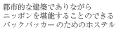 海外からニッポンにやってくるバックパッカーのための安価な旅館(ホステル)です。安価でありながらも、“しっかりと”かつ“わかりやすく”ニッポンの文化を味わっていただきたいということが、オーナーのホスピタリティー溢れる考え方です。夕方、旅人が不安な気持ちで旅館に辿り着く頃、建物には行灯のようにアカリが灯り、旅人をあたたかく迎え入れ、素敵なニッポンでの一夜を過ごします。